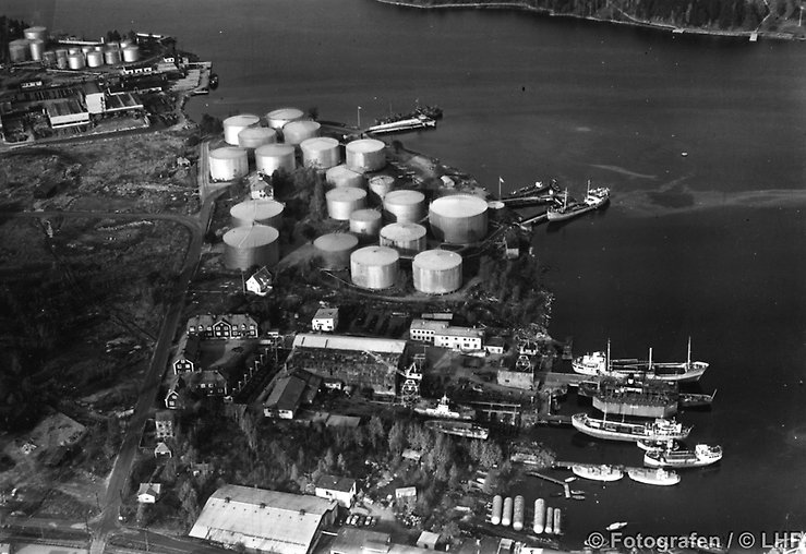 Flygfoto över Gåshagavarvet och Rasta-Cisterna, till vänster Svenska Shell.Foto: Oscar Bladh AB 1958-12-04
