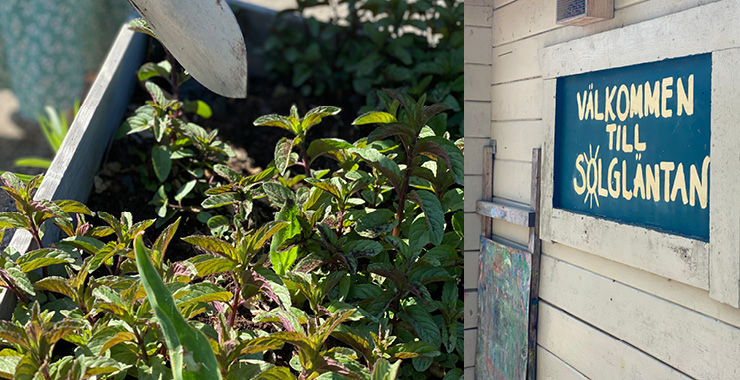 På Solgläntans gård finns både bärbuskar och odlingslådor. Här på väg att plocka lite chokladmynta till föräldrarna som ska komma på sommarfest på eftermiddagen.