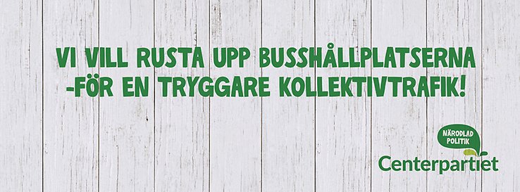 Idag är flera busshållplatser slitna och omoderna. Det är svårt att synas och man riskerar att bli missad när bussen passerar. Vi måste göra det tryggare att vänta på bussen på landsbygden och i tätorter och vi vill därför satsa för att rusta upp och modernisera väderskydd och busshållplatser.