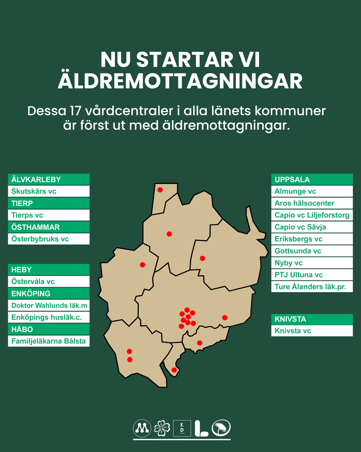 Samtliga kommuner kommer ha minst en äldremottagning. Se vilken vårdcentral som kommer ha det nya arbetssättet på kartan nedan